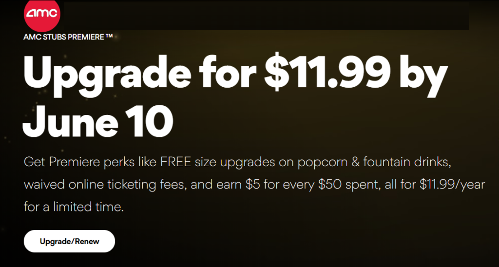 AMC Stubs Premiere Membership $7.50 (50% off) AMC Theaters has AMC Stubs Premiere Membership for $7.50 (50% off). ( Expired ) Posted June 29, 2022 at 12:11 PM EDT. by cheetah. AMC Stubs Premiere Log into our site or app to access your virtual card with ease. Enjoy a Year of Perks for Just $7.50 Join or extend AMC Stubs Premiere™ now and get 50% off premium perks, including $5 reward for every $50 spent, waived online ticket fees, and free size upgrades on popcorn and fountain drinks! Go Premiere AMC STUBS MEMBER EXCLUSIVE
